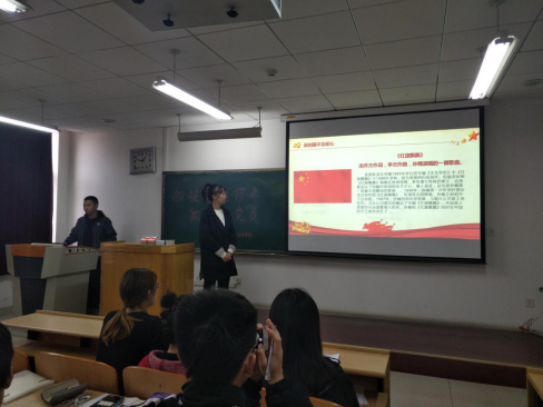 伴随着《红旗飘飘》悠扬的旋律,主题党日活动拉开了序幕。紧接着胡晔同志带领大家共同诵读《大江歌罢掉头东》,悠扬生动的歌曲加上名诗典故的开场调动了大家的学习热情。