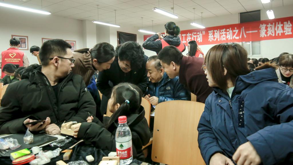 美术馆A101多媒体教室举行,活动共分为篆刻作品展示、篆刻理论讲解、篆刻实践练习三部分,吸引了全校56名教职工和11名小朋友积极参与。