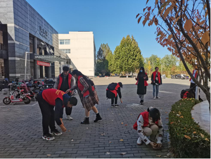 志愿者在美术馆与音乐馆及其周边地区开展美化校园活动。