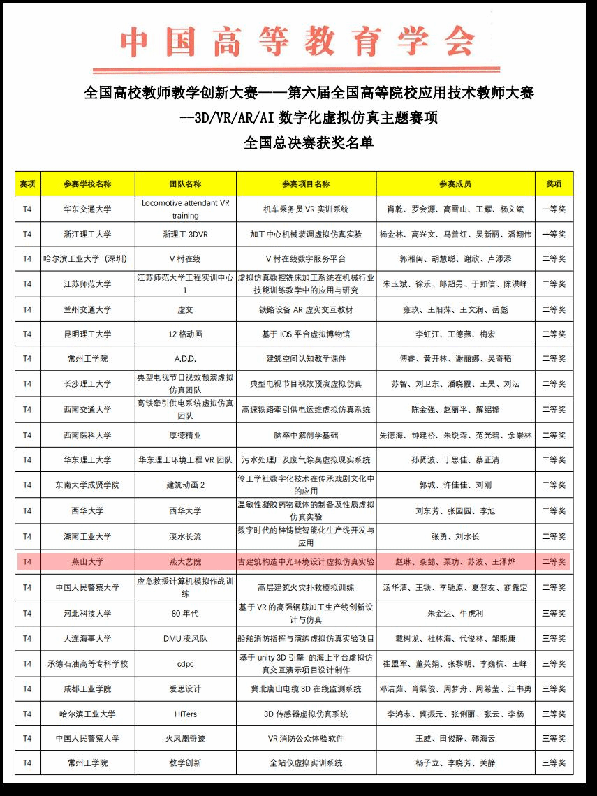 由中国高等教育学会主办的全国高校教师教学创新大赛—第六届全国高等院校工程应用技术教师大赛于本月三日刚刚落下帷幕,经过省赛选拔、国赛答辩等环节,澳门娱乐场澳门娱乐场 赵琳教授带队的《古建筑构造中光环境设计虚拟仿真实验》项目获得了数字化虚拟仿真赛项全国总决赛二等奖的好成绩。