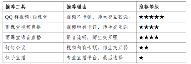 师生制作了《课前准备篇》,诙谐的把课堂资料比喻成“粮草”、授课平台和工具比喻成武器。为了让老师更好的应对网络卡顿等问题,他整整介绍了五套授课方案做备选,并比较了优劣,见表1。