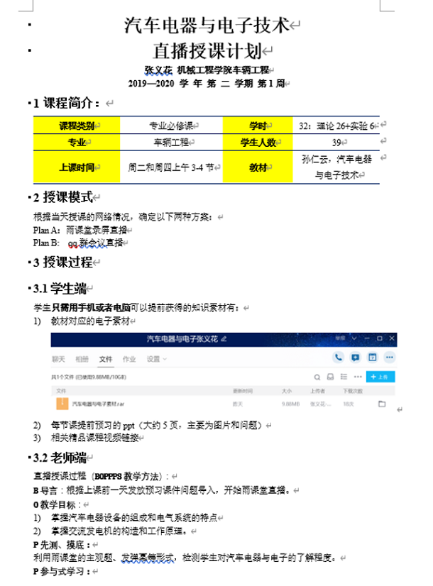 为在疫情防控期间做好车辆工程专业学生的教学工作,车辆工程专业老师利用前期“项目驱动式教学”、“翻转课堂教学”等项目研究成果,结合课程特点积极制定课前、课中、课后教学方案,依托网上教学,激发学生自主学习能力,提高学生的学习效果。